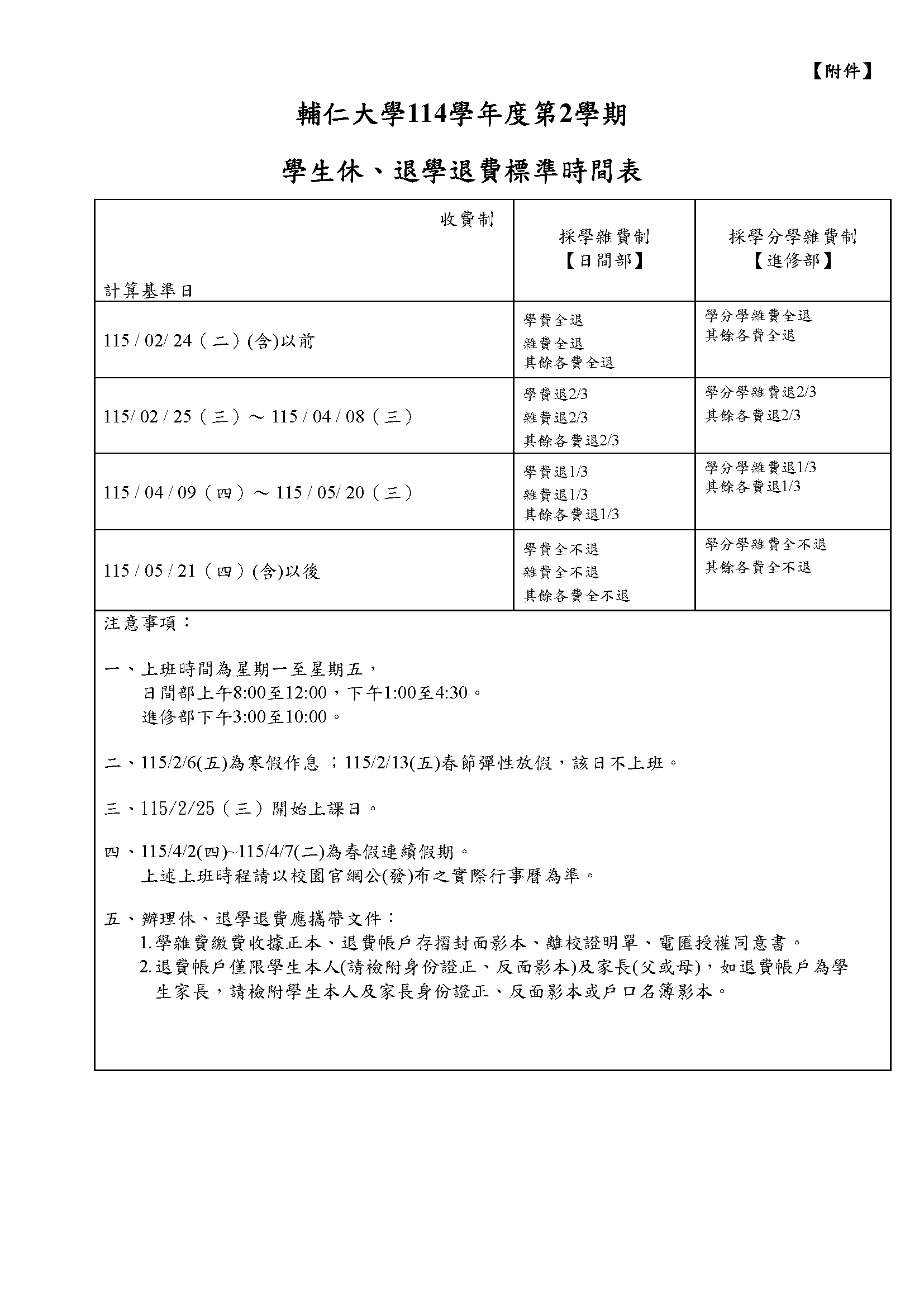 114學年度第2學期學生休、退學退費標準時間表