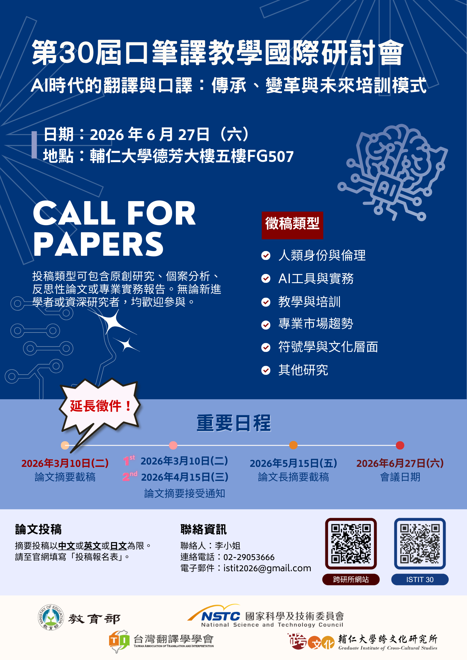 【徵稿啟事:延長收件至3/10(二)】第30屆口筆譯教學國際學術研討會 AI時代的翻譯與口譯:傳承、變革與未來培訓模式
